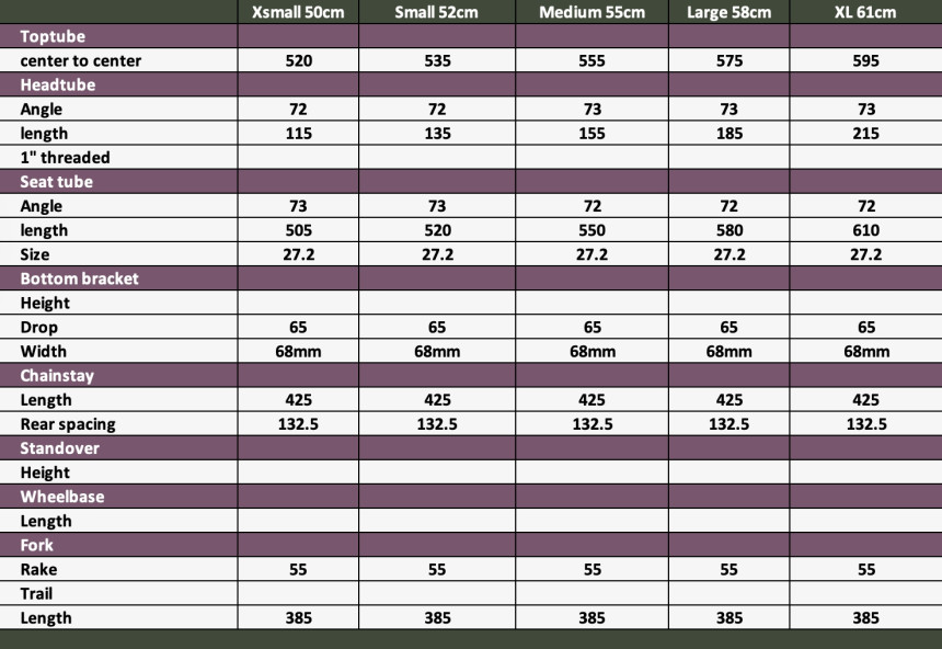 4130 크로몰리 소재로 제작되었으며 TIG 용접 공법을 사용했습니다. 650B 휠 사이즈에 맞춰 설계되었고, 다운튜브 쉬프터와 펜더 및 랙 장착용 마운트를 갖추고 있습니다. 브레이크는 캔티레버 림 브레이크를 사용하며, 싱글 스피드 호환을 위해 슬라이딩 드롭아웃이 적용되었습니다. ISO 충격 테스트를 통과한 제품입니다.